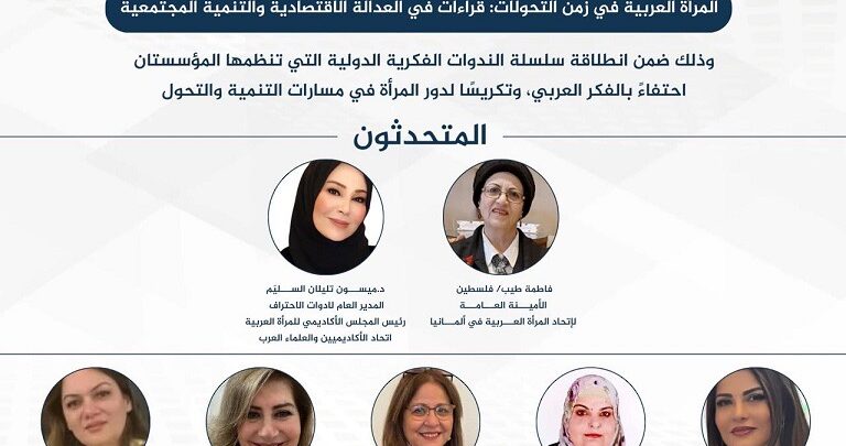 تم عقد ندوة المرأة العربية في زمن التحولات: قراءات في العدالة الاقتصادية والتنمية المجتمعية مساء أمس الأربعاء 11 / يونيو 2025عبر منصة زوم. بحضور أكثر من 97 سيدة حول العالم. ويأتي عقد هذه الندوة ضمن انطلاقة سلسلة الندوات الفكرية الدولية التي تنظمها المؤسستان، احتفاءً بالفكر العربي النسوي، وتكريسًا لدور المرأة في مسارات التنمية والتحول.