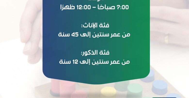 هذا وسيكون القسم الصباحي متواجدا من الساعة السابعة صباحة إلى الثانية عشرة ظهرا وفئة الإناث من عمر سنتين إلى خمس وأربعين سنة وفئة الذكور من سنتين إلى أثني عشرة سنة