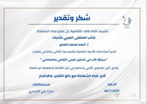 منحت قناة قاف الثقافية نائب الملتقى العربي للأدباء بالسعودية د/أحمد محمد ناصر المدير شهادة شكر وتقدير لمشاركته القيمة في الحوار الثقافي الاجتماعي بالقناة تحت عنوان *(سردية الأب في تشكيل الوعي الثقافي والاجتماعي