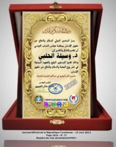 حصدت الدكتورة وسيلة بنت محمود الحلبي، سفيرة الإعلام العربي. وسفيرة السلام. والكاتبة والإعلامية المعروفة، “العضوية الذهبية” لعام ٢٠٢٥ و*”درع شكر وتقدير”* من المنتدى الدولي للسلام والدفاع عن حقوق الإنسان التابع لمنظمة مجلس الشباب التونسي لعام 2025،