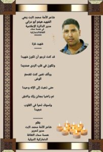 شاعر الأمة محمد ثابت ينعى / الشهيد هيثم أبو درابي مدير الدائرة الإعلامية بهمسة سما الثقافة ٠