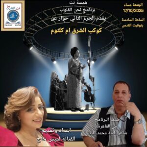 في سهرة خاصة عبر برنامج لحن القلوب على المنصة الدولية همسة نت، تستضيف الفنانة لميس حاج شاعر الامة محمد ثابت في رحلة زمنية ماتعة، تعيشون خلالها ساعة كاملة مع إبداع سيدة الشرق أم كلثوم، وأسرار حضورها الذي لا يغيب.