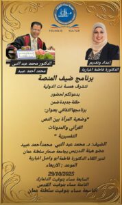 ضيف المنصة “على همسة نت الدولية إعداد وتقديم: الدكتورة فاطمة أبو واصل إغبارية ضيف البرنامج :الدكتور محمد عبد النبي محمد أحمد عبيد، عضو هيئة التدريس بجامعة صحار في سلطنة عمان