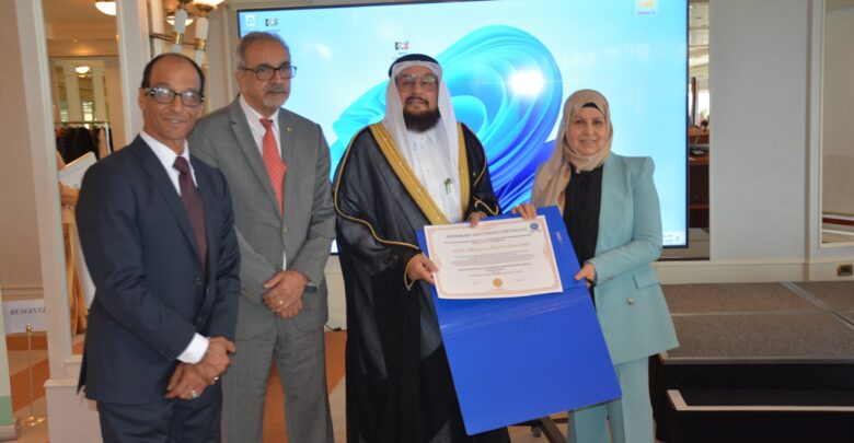 معالي الدكتور عبد العزيز أمين سرحان يتلقى الدكتوراة الفخرية الأولى من منظمة همسة سماء الثقافة الدولية – الدنمارك، وزوجته تُكرّم بدرع الشكر والتقدير