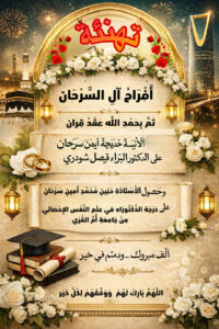 بمناسبة حصولها على درجة الدكتوراة في علم النفس الإحصائي من جامعة أم القرى بمكة المكرمة، يوم الاثنين 9 رجب 1447هـ، متمنين لها مزيداً من التوفيق والنجاح في مسيرتها العلمية والعملية.