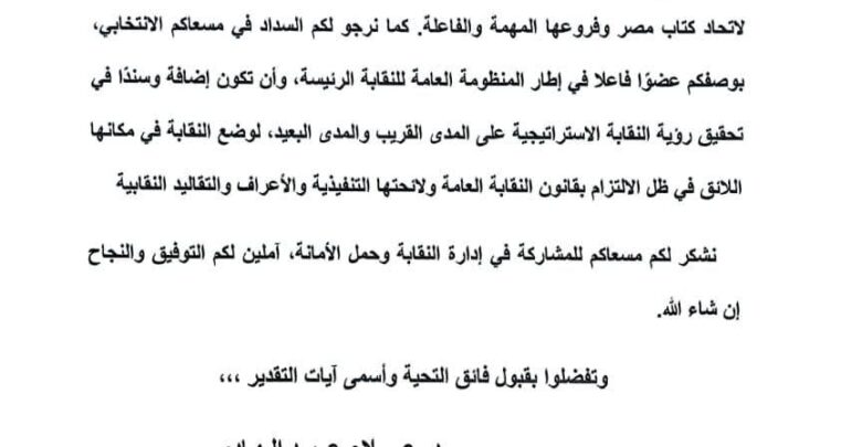 دي عينه بسيطه من اللي حصل آخر ست شهور بس، عن التزامك بقانون النقابه ولايحته التنفيذيه والأعراف والتقاليد النقابيه، علشان يعرف الأستاذ المكرّم اللي بتتمناله التوفيق في مسعاه، ويبقى إضافه وسند في تحقيق الرؤيه الاستراتيجيه اللي محدش شايفها أصلًا…