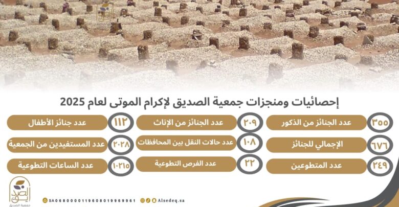 أعلنت جمعية الصديق لإكرام الموتى بمنطقة جازان عن إحصائيات ومنجزات أعمالها لعام 2025م، والتي تعكس حجم الجهود المبذولة في خدمة المجتمع والارتقاء بخدمات إكرام الموتى، ضمن إطار مؤسسي منظم يواكب تطلعات القطاع غير الربحي.