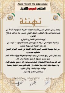 يتقدم رئيس الملتقى العربي للأدباء بالسعودية د. أحمد محمد المدير بالتهنة أصالة عن نفسه ونيابة عن رواد الملتقى العربي للأدباء بالتهاني والتبريكات للدكتور ابو حماد ناصر الانصاري المليباري لحصوله على درجة الدكتوراه من جامعة كاليكوت بالهند