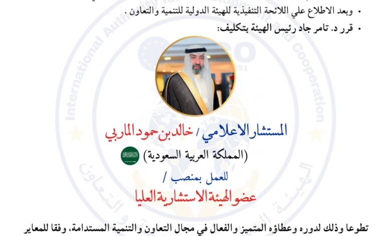 بعد الإطلاع على النظام الاساسي للهيئة الدولية للتنمية و التعاون التابعة للإتحاد الأوروبي المسجلة برقم ( 871251091 pic ) تم تكليف المستشار الإعلامي السعودي خالد بن حمود الماربي عضواً للهيئة الإستشارية العليا نظراً لجهوده المتميزة في العمل التطوعي و التقارب بين الأديان و حضوره الإعلامي المميز.