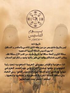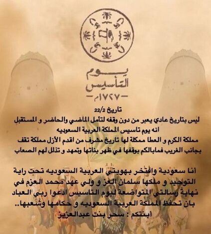 تاريخ 22/2 ليس بتاريخ عادي يعبر من دون وقفه لتأمل الماضي والحاضر والمستقبل ، انه يوم تأسيس المملكة العربية السعودية ، مملكة الكرم والعطاء مملكة لها تاريخ مشرف منذ الأزل، مملكة تقف بجانب الجميع دون استثناء فما بالكم بوقفتها مع بناتها الأيتام ذوي الظروف الخاصة ، لتمهد وتذلل لهم الصعاب أنا سعودية وأفتخر بهويتي العربية السعودية تحت راية التوحيد ، وملكها خادم الحرمين الشريفين الملك سلمان العز ، وولي العهد صاحب السمو الملكي الأمير محمد العزم، و في نهاية رسالتي بيوم التأسيس أدعوا ربي بأن تحفظ المملكة العربية السعودية وحكامها وشعبها من كل شر ويديم عليها امنها وأمانها .