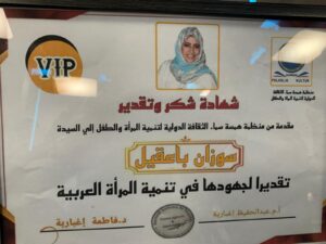 وخلال الفعالية، قام ممثل المنظمة في إيطاليا الإعلامي إكرامي هاشم بتسليم شهادة شكر وتقدير للفنانة سوزان باعقيل، وذلك نيابة عن رئيسة المنظمة الدكتورة فاطمة إغبارية ومؤسسها المهندس عبد الحفيظ إغبارية، تقديرًا لإسهاماتها المتميزة في المجال الفني ودورها في إبراز صورة المرأة العربية المبدعة.