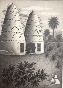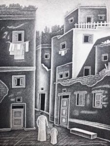 لكـن الحـس الفطـري محكـوم لديـه – في نفـس الوقـت – بميـزان نغمـي واعٍ يحقـق الإيقـاع والتـوازن بين الأجـرام والمسـطحات، وبين الأضـواء والظـال، وبـن مناطـق الزحـام والفـراغ، وبـن زاويـا الرؤيـة مـن تحـت مسـتوى النظـر وأخـرى مـن فـوق مسـتوى النظـر، وبيـن كثافـة التفاصيـل و تلخيصهـا، و في كل ذلـك يلعـب الخـط الأسـود وحيـدًا كآلـة موسـيقية منفـردة، بحـس شـعبي أقـرب إلى حـس النـاي أو الربابة.
