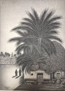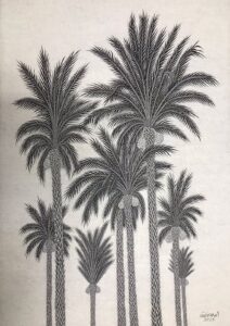 و يرسـم جـزع النخلـة قحفًـا قحفًـا .. و جريدهـا سـعفة سـعفة، وكذلـك أغصـان الشـجرة و لحـاء جزعهـا و أوراقهـا، و يرسـم ألـواح القـوارب و عوارضهـا و قيعانهـا و مجاديفهـا وهـي تتـوازى أو تتقاطع أو تتجمـع أو تتفـرق، بنفـس الصـر و الأنـاة.