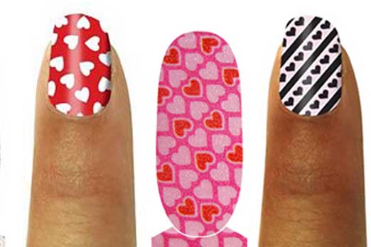 ببساطةٍ يمكنك شراء علبة ملصقات أظافرٍ على شكل قلوبٍ صغيرة ، ويمكنك استبدال الملصقات بقطع المجوهرات لتشكلي من خلالها رسوماتٍ تعبر عن عيد الحبّ ولعل آخر صيحات الموضة أحجار الباستيل.
