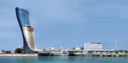 يعرف باسم “بوابة العاصمة” وهو عبارة عن ناطحة سحاب مائلة بشكل مذهل بزاوية 18 درجة إلى الغرب أي تميل أربع مرات أكثر من برج بيزا في إيطاليا، يبلغ طول البرج 160 متر وهو مكون من 35 طابقا ويعد أطول مباني أبوظبي، كما أنه نقطة محورية في مركز أبوظبي الوطني للمعارض “أدنيك”، ويضم أيضاً فندق الحياة.